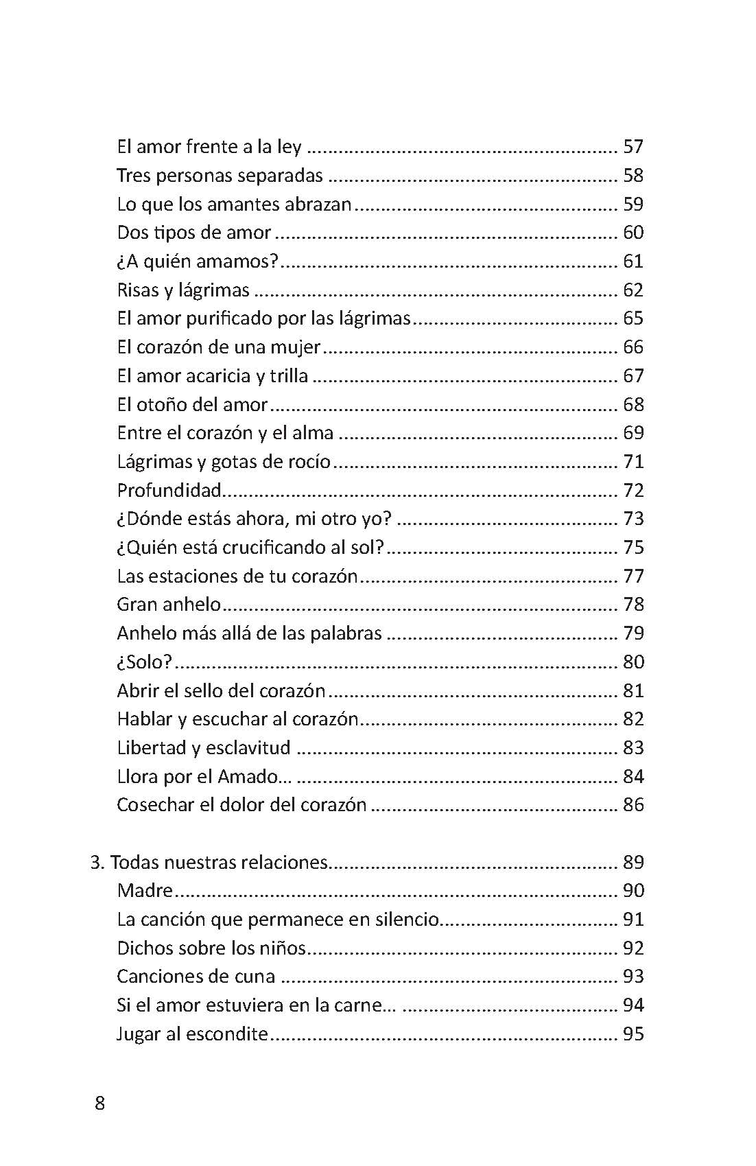Sus poemas, aforismos y relatos abarcan un amplio abanico de reflexiones, en las que resaltan las emociones y los vínculos humanos. Su sensibilidad y sabiduría quedan plasmadas en estas líneas donde caben la pasión, el deseo, el amor idealizado, la justicia y los retos de tratar con amigos, vecinos y extraños.